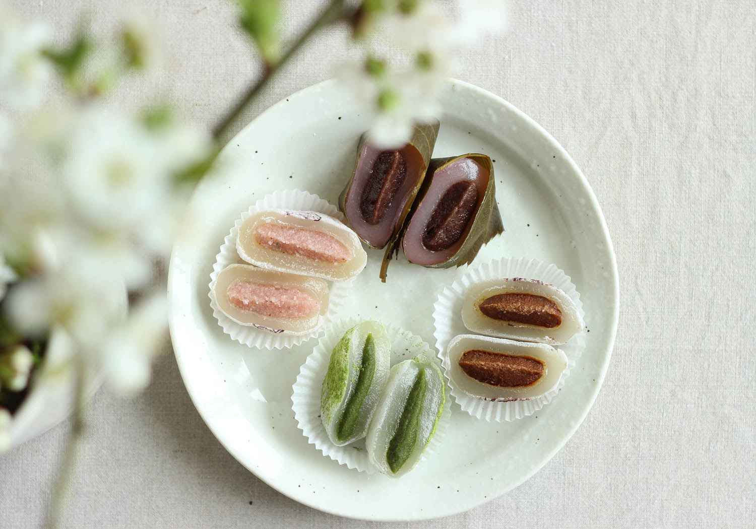Hanami signifie en japonais « regarder les fleurs ». Pour célébrer le printemps à la japonaise, nous vous proposons ce coffret de 8 mochis composé de 2 iconiques sakura mochis et de 6 autres parfums au choix parmi notre carte du moment. Le sakura mochi est une douceur dégustée au Japon à l’arrivée du printemps, enveloppée d’une feuille de cerisier saumurée comestible. Il existe plusieurs versions du sakura mochi. La nôtre consiste en un mochi légèrement poudré et plus dodu que nos classiques, fourré d’une crème de haricot rouge (anko) et dont l’enveloppe rosée est elle-même enveloppée de la fameuse feuille de cerisier saumurée.