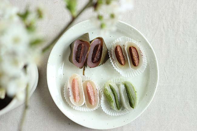 - Sakura mochi : Sucre de canne non raffiné*, riz gluant, haricots rouges (azukis)*, feuille de cerisier saumurée, fécule de tapioca*, sirop de glucose*, glycérine végétale*, colorant (jus de betterave)*.
