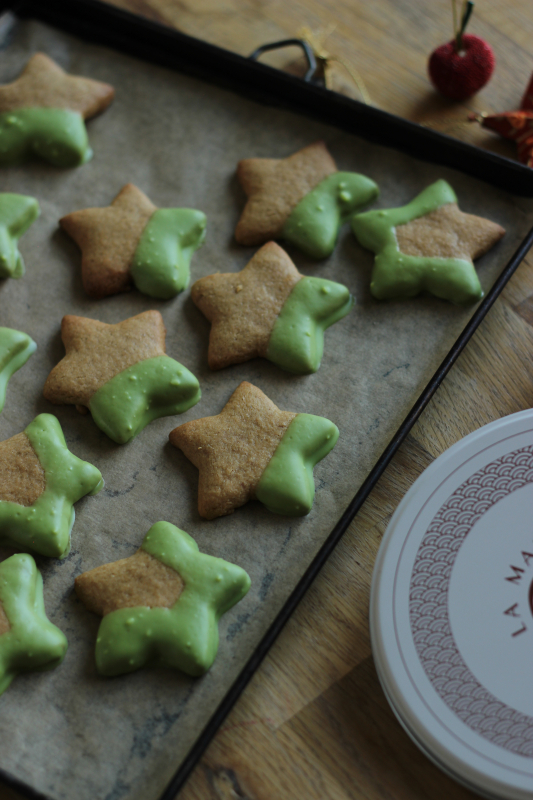 4. Lorsque les biscuits sont bien froids (vous pouvez même les mettre au réfrigérateur pour que le chocolat fige encore plus vite), faites fondre au bain-marie le chocolat. Lorsqu’elle est bien fondu, ajoutez hors du feu le matcha, mélangez. Trempez-y les biscuits, et laissez durcir sur une plaque garnie de papier sulfurisé.