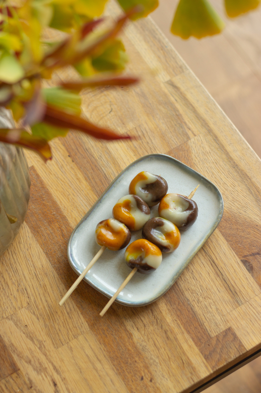Pour marquer ce moment spectaculairement beau de l’année, je vous propose de préparer des kôyô dango à la manière de leurs cousines printanières, les hanami dango. Pour rappel, les dango sont des types de mochi, que l’on cuit à la manière des gnocchis et que monte en brochettes. Les plus courantes sont les mitarashi dango, qui sont nappées d’une sauce sucrée salée à la sauce soja. Mais pour ces dango-ci, je vous propose de les parfumer avec les saveurs reines de saison : les épices chaudes et le chocolat.